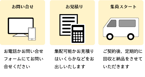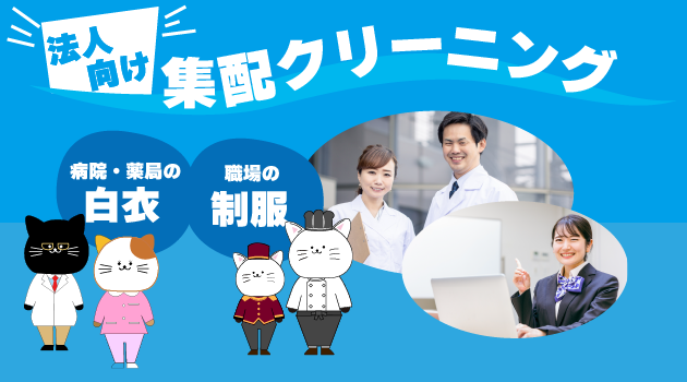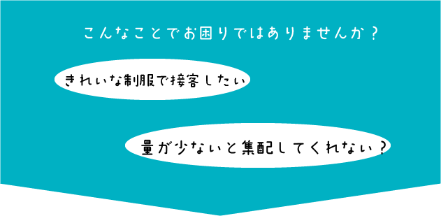 法人向け集配クリーニング 染み抜き、おまかせください エリやソデの油汚れ、ポケット付近のインクなど、可能な限りおとします 少ない量でも対応します! 出す予定のお品物が少なくてもご安心ください 集荷~クリーニング~配達まで自社社員が丁寧に対応します 預け~お届けまでは2~3日間です お申し込みの流れ 集配サイクル