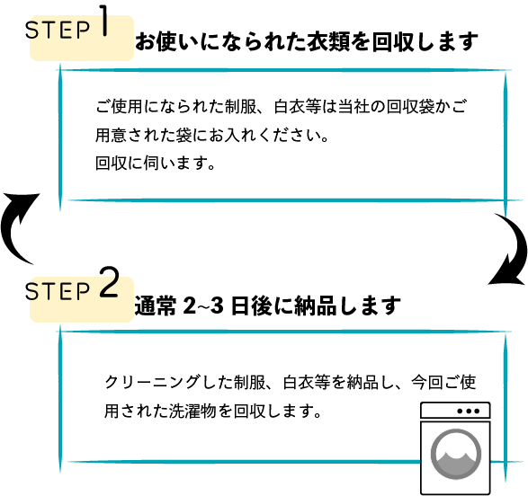 法人向け集配クリーニング 染み抜き、おまかせください エリやソデの油汚れ、ポケット付近のインクなど、可能な限りおとします 少ない量でも対応します! 出す予定のお品物が少なくてもご安心ください 集荷~クリーニング~配達まで自社社員が丁寧に対応します 預け~お届けまでは2~3日間です お申し込みの流れ 集配サイクル